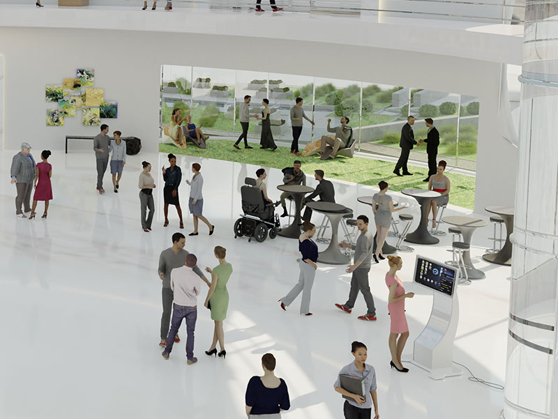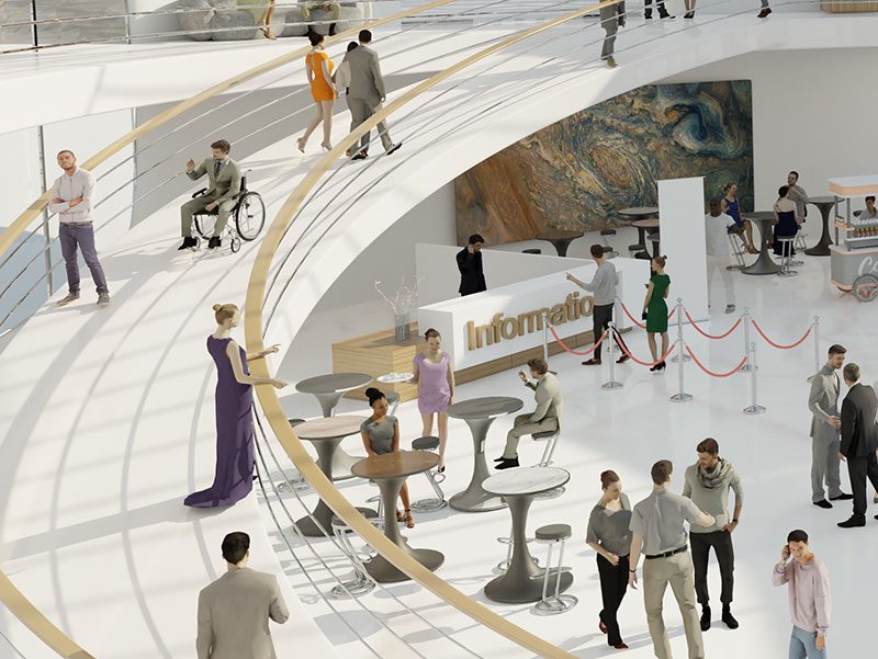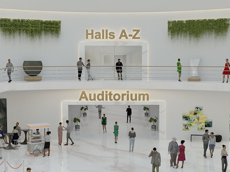 עיצוב לובי לפלטפורמת כנסים וירטואלים. תמונות ההדמיה נוצרו לצורך הטמעה במערכת ממוחשבת. כל אורח שמגיע לכנס וירטואלי, מבקר קודם כל בלובי המפואר ומשם ממשיך לאחד מהחדרים הוירטואלים.
